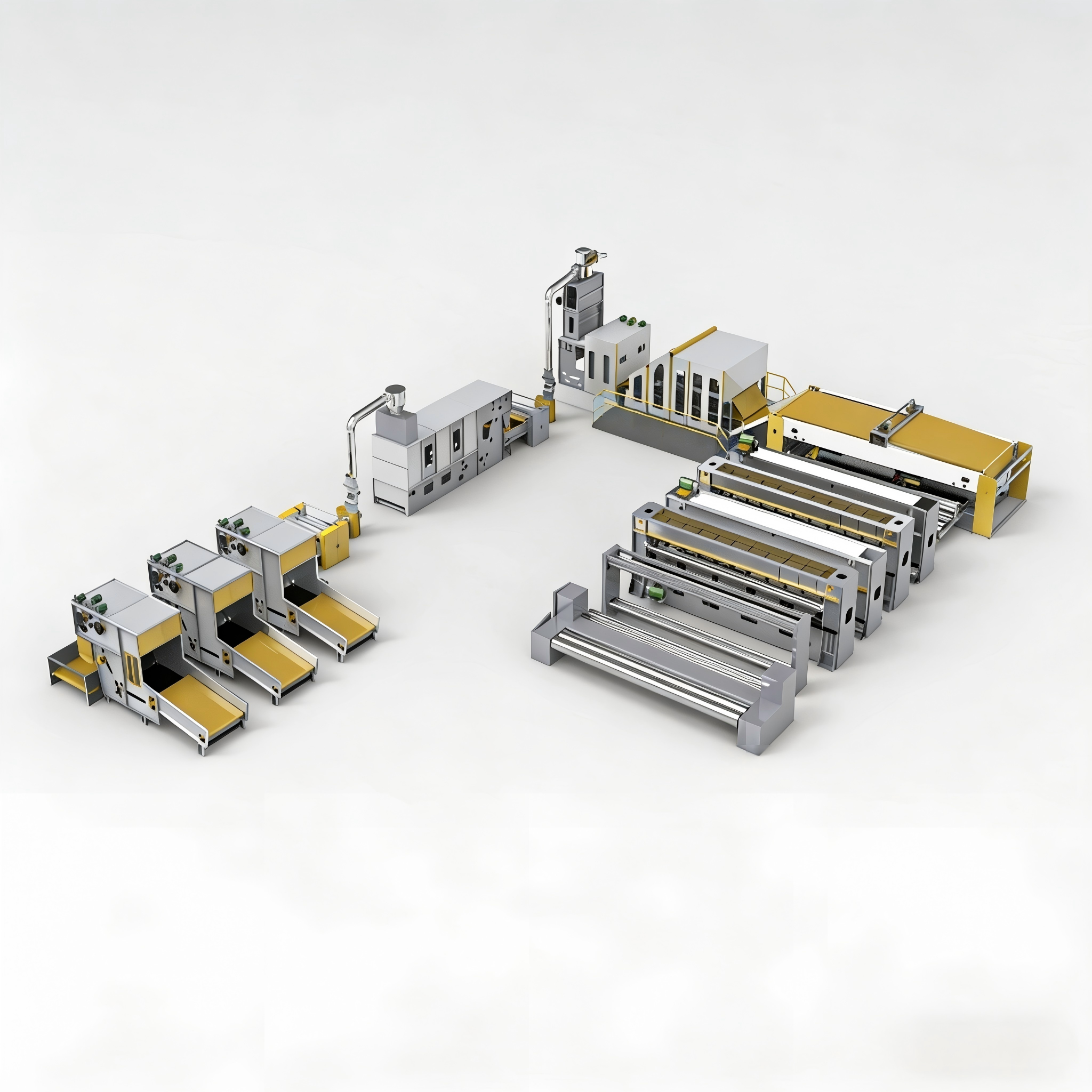 4、定量的纤维在梳理机梳出组成网状纤维薄层,再由铺网机均匀折叠成所需厚度及重量后,送入下一道工序;