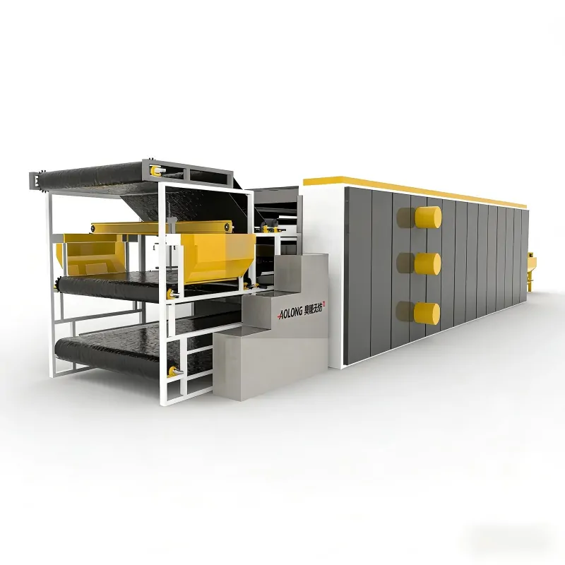 气流成网废毡烘箱非织造布生产线将纤维经过开松,除杂,混合后喂入主梳理结构,得到进一步的梳理后呈单纤维状态,在锡林高速回转产生的离心力和气流的共同作用下,纤维从针布锯齿上脱,由气体输送并凝聚在成网帘上,形成纤维三维杂乱排列的纤网进入烘箱处理,最后分切成型。